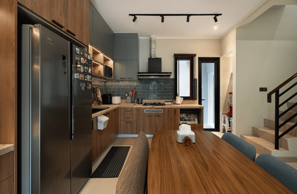 Meja makan yang menyatu dengan dapur menjadi penghubung alami, tempat sarapan pagi, hingga obrolan kecil yang mempererat hubungan keluarga.